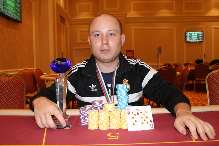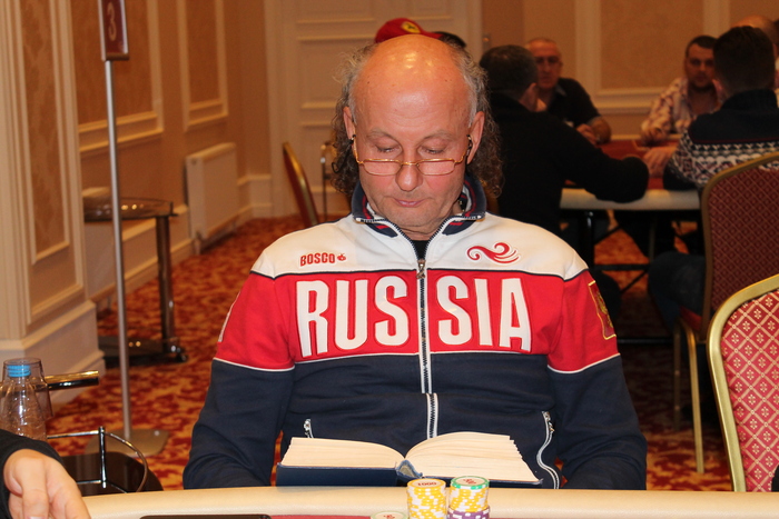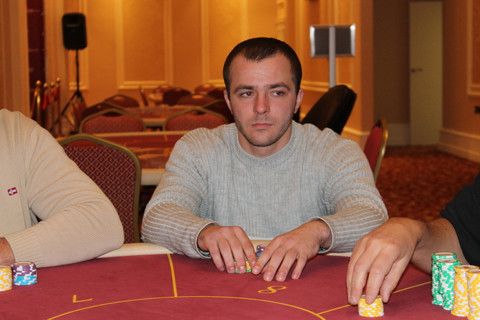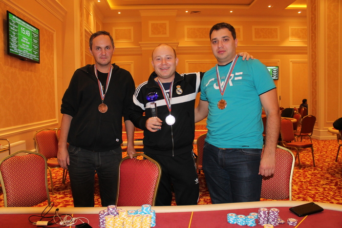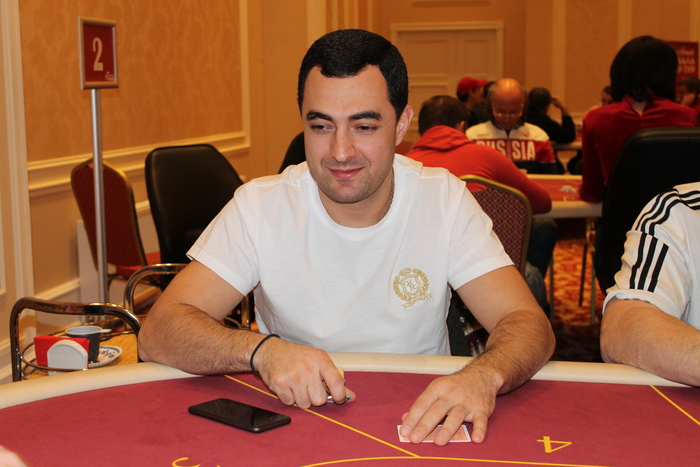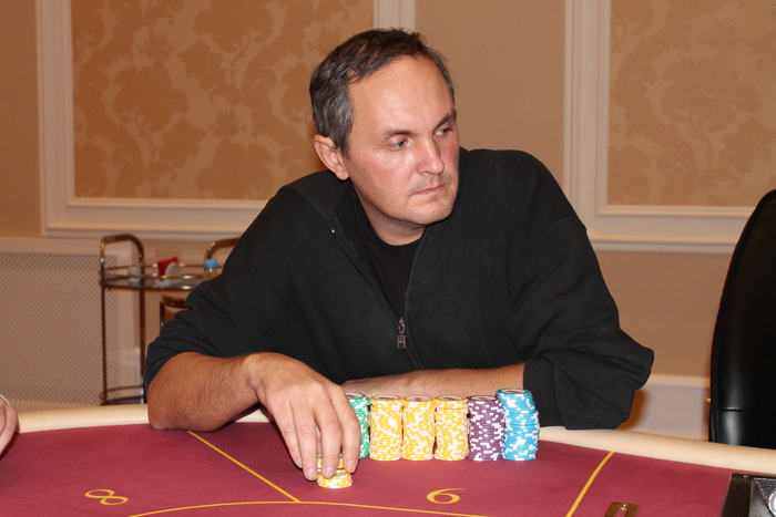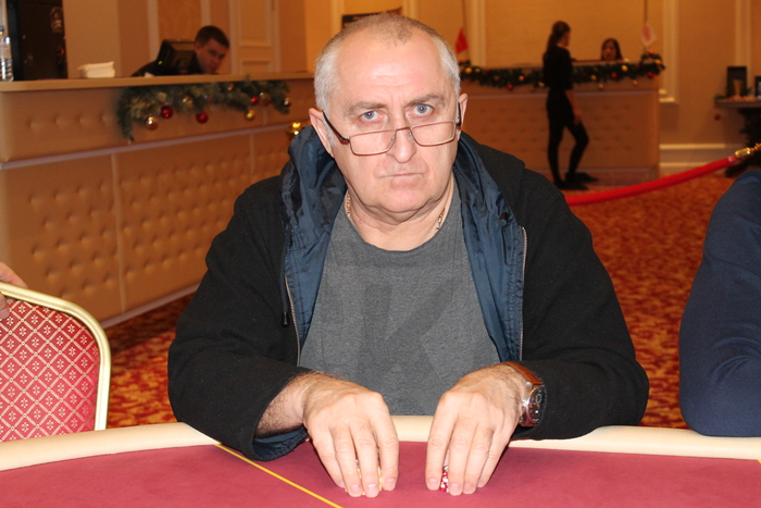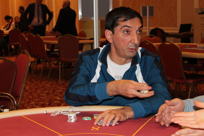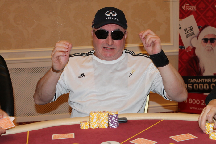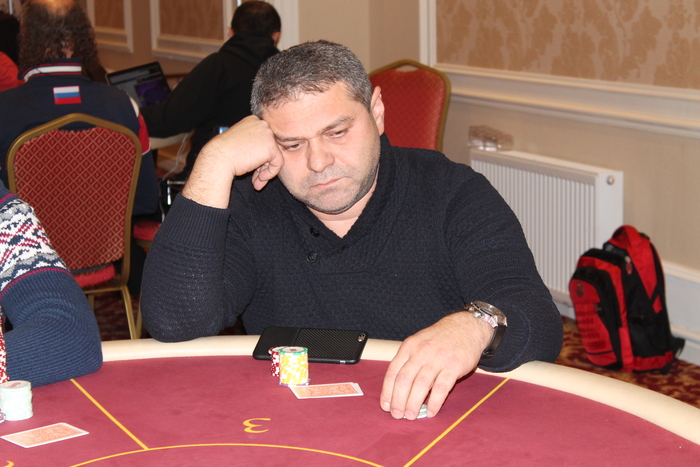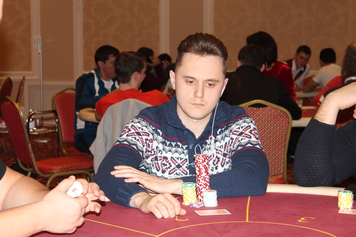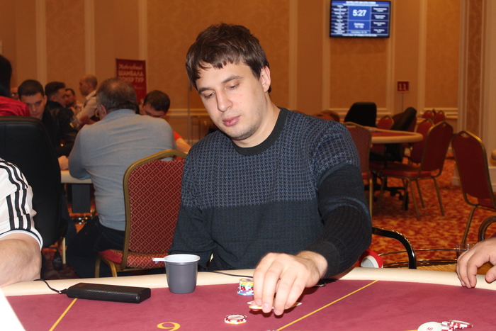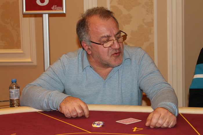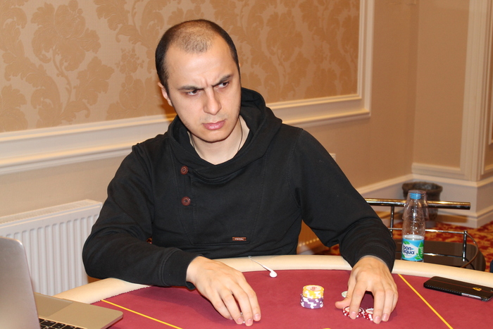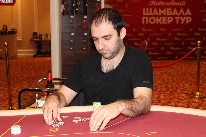 Александр Черников открывает 5К на , Эдуард Барсегян колл 5К, Тамази Шелия выставляется алл-ин 11,2К с , Александр делает колл, Эдуард выставляет свой алл-ин 24.5К на , получает мгновенный колл от Александра, банк 64,4К, флоп , терн , ривер