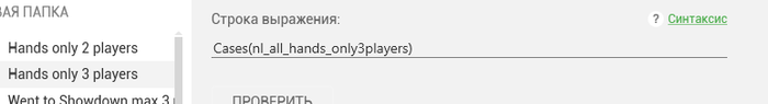 Теперь пример сложнее: пытаемся узнать количество рук для SpinAndGo, в котором есть и 2-max и 3-max. С учетом бинарной логики алгоритма, стат определения рук в спинах должен выглядеть как: Если же мы попытаемся сделать универсальной стат, в котором укажем от 2 до 3 игроков, то получим неправильную цифру, аналогичную той если бы мы считали по формуле "Cases(hands3) + Cases(hands2)". При этом в сводном стате нам величина количества рук в 2max и 3max априори неизвестна. В этом и косяк бинарной логики. Для примера спин с неизвестным игроком, в котором сыграно 22 сдачи: По статам: