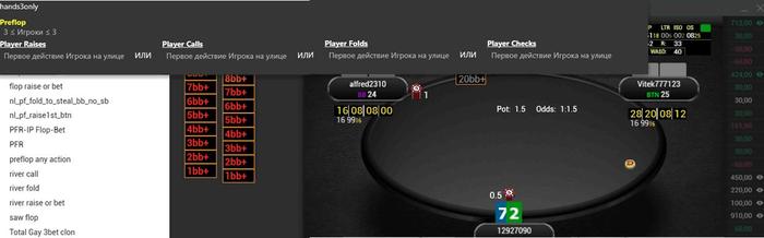 Если по тому же принципу мы постараемся сделать стат 3-max, то по итогу обнаружим, что сложный стат для 3-мах будет показывать вдвое больше рук, чем сыграно раздач.Дело в том, что в рамках одной раздачи стат будет считаться дважды. Скажем для игрока на BU h2n для одной игровой раздачи зафиксирует BUvsSB и BUvsBB. В результате то, что игрок считает за одну руку, будет алгоритмом интерпретировано как две. Поэтому правильный сложный стат подсчета для 3-max должен выглядеть так: