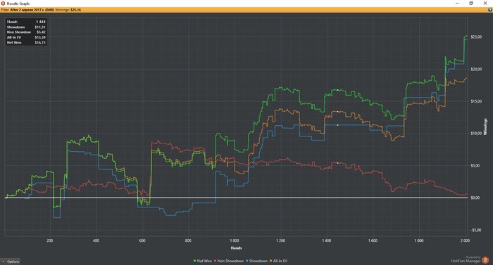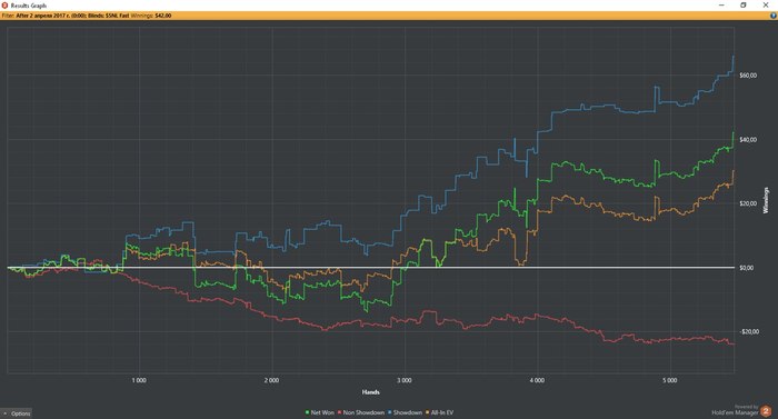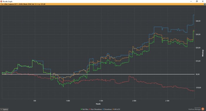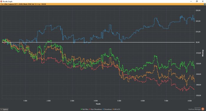 Сегодня поиграл чуть подольше! Решил попробовать несколько плюсовых мувов, но по графику видно, как красная резко пошла на дно. Думал щас бабло буду лопатой гребсти, но мало знать мувы, нужно хорошо играть постфлоп, так что меня быстро поставили на место ))