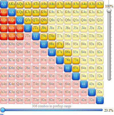 MoonlightAA @ 10.6.2017 Помоему как раз наоборот, ты слишком агрессивно играешь свой мусор с которым следует чаще сдаватся. Разномастный бродвей от десятки это хуевые руки для сквиза, более менее норм еще АQo KQo, все остальное это мусор. 3бет в 17% общий это не нормально, у тебя там куча мусора и любой рег это знает. Сужай диапазоны, т.к. твой уровень игры не позволит тебе иметь синюю линию в ноль, как должно быть при твоем стиле игры. Перестань 3бетить руки типа слабых разномастных тузов, слабого разномастного бродвея, мелких коннекторов и гаперов типа 54 64 75 и т.п. всё это шлак, который фолдится на оупенрейз, и не важно что опп там фолдит 80% на 3бет. Весь свой автопрофит с префлопа ты тупо заливаешь в постфлоп игре. Сужайся до 20/18 с 3бетом 7-8% и играй себе спокойно.