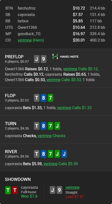 Hero bets $0.22, BTN calls $0.22 River: ($0.83, 2)