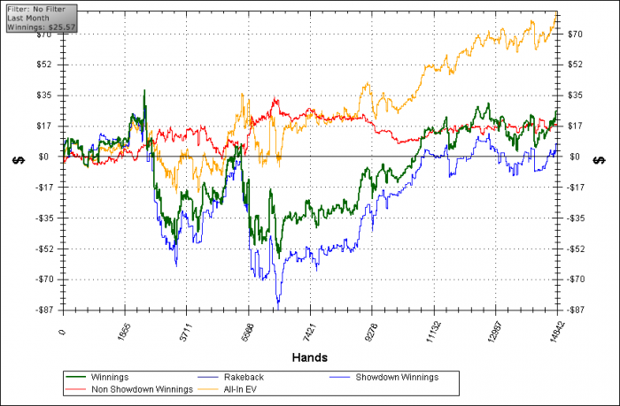 о делах в холдеме я уже частично упоминал. поймал даун и за 700 рук нл10 залил полБРа. миксуя нл5 и нл10 чучуть подлечился, но опять крупно залился на 10ке. после чего до конца месяца восстанавливался только на нл5 и даже вывел месяц в небольшой плюс