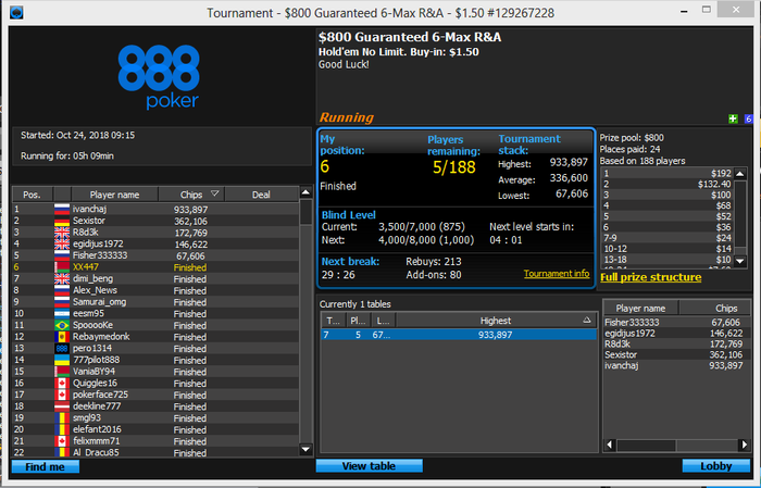 Рук с финального нет. Глюканул холдем. Зашла 2-м стеком, но стеки очень не комфортные в бб. Я самый маленький и не привлекательный нокаут - не закрывали лузово. Еще посадили между не очень комфортными игроками. + Руки не зашли