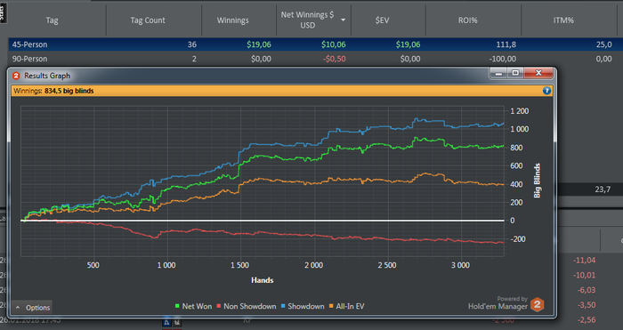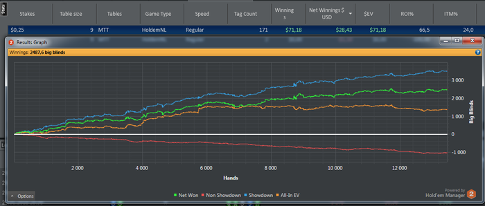 В общем дела так себе, отыграл 140 турниров по 0,25.В полном жопестрике. Итог +0,57$.