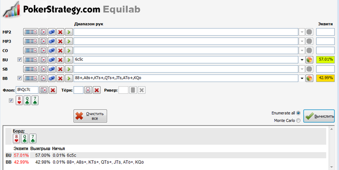 Я хз ты о чём ))) У тебя гигантское эквити, тебе по шансам колить любую ставку, даже овербет пуш на флопе Немного портит малину то, что у него могут быть доминирующие тебя фд, но их не так много как топ пар и оверпар (а против них ты стоишь отлично). Короче играй как хочешь, можешь колить потбеты, можешь сразу пушить, можешь просто рейзить. Если не готов выставляться с монстр-дро в 3бет поте, то тогда не заходи с такими руками под 3бет , иначе без диспы никак.