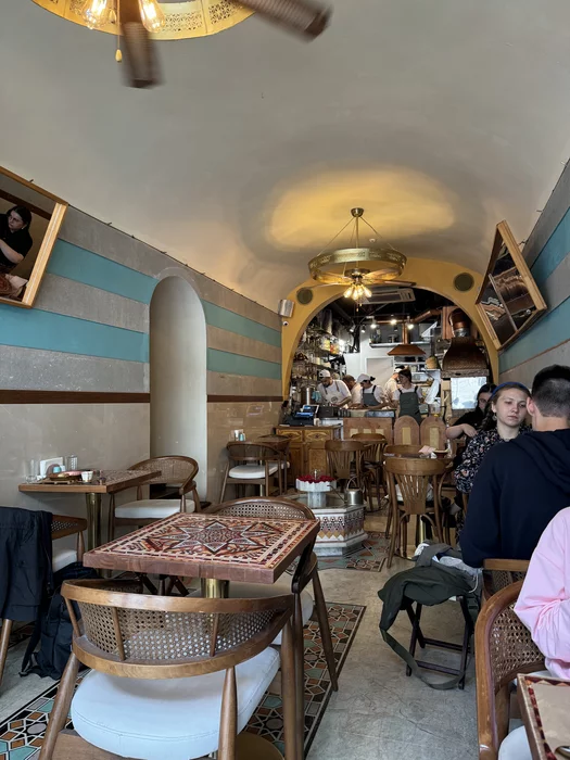 Когда оказываешься внутри появляется ощущение, что ты гулял по Стамбулу в районе Гранд Базара и зашел в маленькое кафе. В первую очередь такое впечатление из-за габаритов места. Весь ресторан вместе с кухней размещается на площади примерно в 30 кв.м. На кухне в 5 кв.м. работает одновременно до 6 человек, в заведении часто все столики заняты, но при этом никто никому не мешает хоть и расстояние между вами не больше метра.