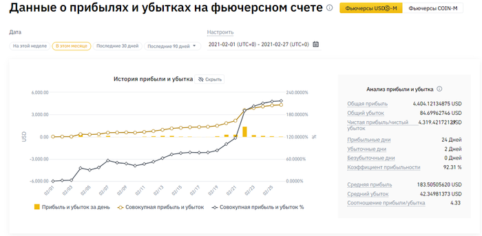 Отчет за февраль Немного преждевременный отчет, т.к. завтра писать будет некогда, а в понедельник трекер перейдет на новый месяц(у меня free-бомж-версия на последний месяц ) и еще сегодня во мну уже два пива и желание похвастаться поделиться результатами. Результаты торгов оказались выше ожидаемых и, наверное, поэтому я просто не знал что делать. Было принято героическое решение не нарушать первый инженерный принцип- никогда не трогать, то что хорошо работает . Были какие то мелкие фиксы и коде и в страте, но ничего глобального не добавлял. Да и кто работает над игрой, во время явного переапа, когда казна пополняется ? Радует, что система не только пережила просадки в 10-15%, на которые она рассчитана, но прилично нажила. Волатильность сумасшедшая, тренд бычий тут все будут молодцы, расслаблять булки еще конечно очень рано, но очень радует. Есть идея сделать автоматический сбор положительного фандинга на бинансе, разраб уже вовсю пилит бота, работаем над логикой входов-выходов, скоро тесты. В это вышло прилично +EV, по своим цифрам не сориентирую, там каша, но по расчётам все супер. Поэтому все усилия в эту область. Еще хочется принять участие во всяких активностях, как пособираю свободных $.Все свободные средства перенаправляются, как и планировал, в относительно безопасные места- в ликвид-пулы, сбор фандинга и просто резерв на кошелек. Из неприятного: - у меня просочилась рефка на кэшбэк, на который я мало-мальски вышел, поэтому копеечку недополучил. - в коде страты, или это глюки ТВ, есть неприятный и не воспроизводимый баг. Иногда остаются какие то мелкие куски ордеров, которые приходиться закрывать периодически вручную. Появляются они при сильном и сложном поведении цены в одной свече(вверх-вниз-вверх или наоборот на 3-7% ), но данном этапе мне с этим не справиться. Некритично, но неприятно, что из автомата я получил полу-автомат. Приходится 1-2 раза в день проверять как там дела у бота. Но про всякие ДУ пока можно забыть.