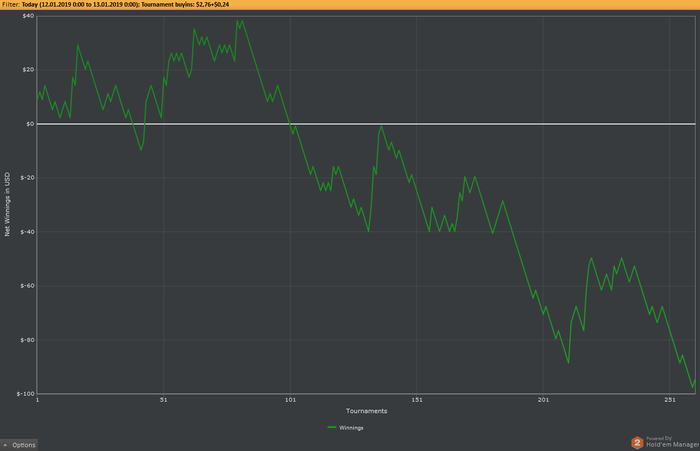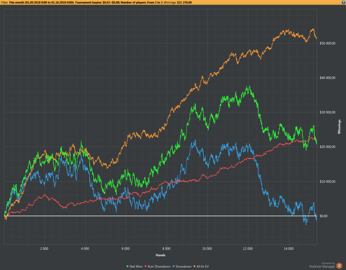 Уже практически освоился на тройках. Привык к байину и поляне. ЕВ-стрик потихоньку отпускает, но еще должно апнуть поприличнее. Потому что всё же за 100 турниров стабильно видеть по 2-3 раза АК в АА и по два раза КК в АА, при этом совсем не видя таких кулеров в свою сторону - это абсолютно ненормально.