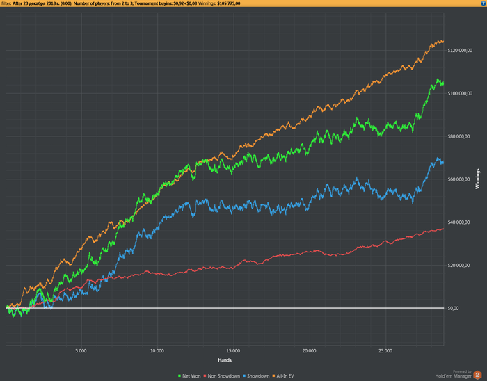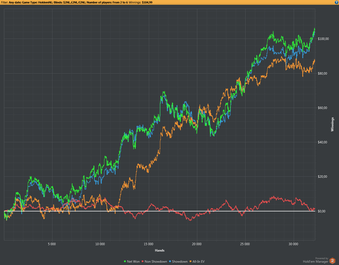 С начала октября неспешно изучаю игру в безлимитный холдем со ста большими блайндами в стеке. Будучи давным-давно регуляром фикс лимита, мечтал побить нл2, но тогда с этой дисциплиной ничего не выходило. И вот мечта сбылась вроде как. Не топ-рег, конечно, но уже всем могу рассказывать, что плюсовый регуляр нл2.