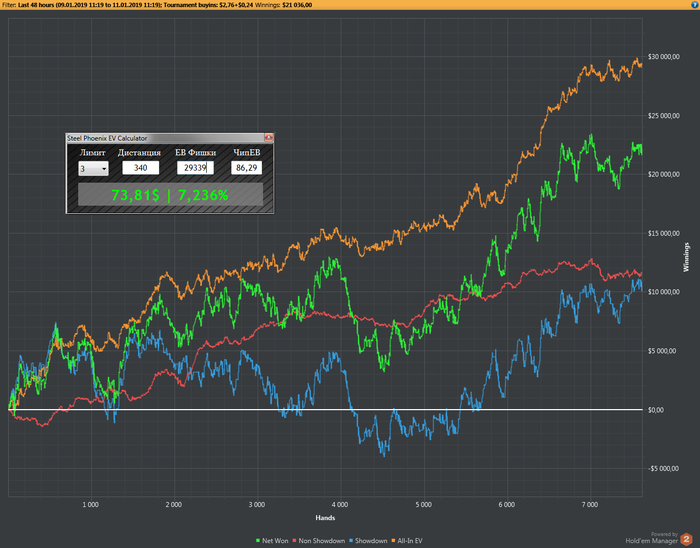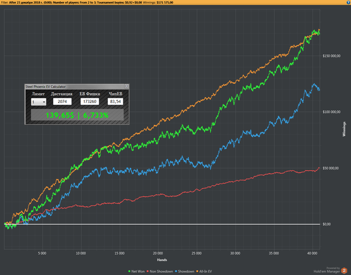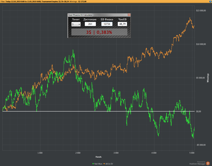 В графиках вся эта хрень выглядит так. Кое как в ноль по ЕВ катаю. Ума не приложу, как при таком ЕВ стрике я умудрился перебрать 15к фишек.