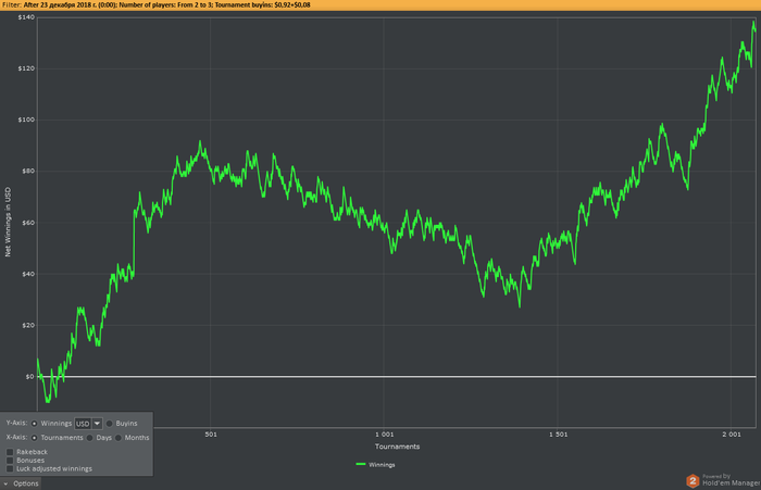 Вступил в пул в конце декабря. Пока играю единички. Нужно 2000 турниров в 75+ фишек отыграть, чтобы пустили на тройки. Пока иду так: 1500 турниров в 83 фишки. Качество игры сильно выросло после того, как практически перестал тильтовать от переездов. Уже и забыл когда такое удовольствие от игры получал. Да такого, наверное, и не получал никогда. Ощущения, будто читы на бессмертие подрубил и плевать (почти), когда на 25бб фиш с 63o в префлоп выставлении обыгрывает твои AA.