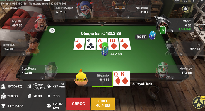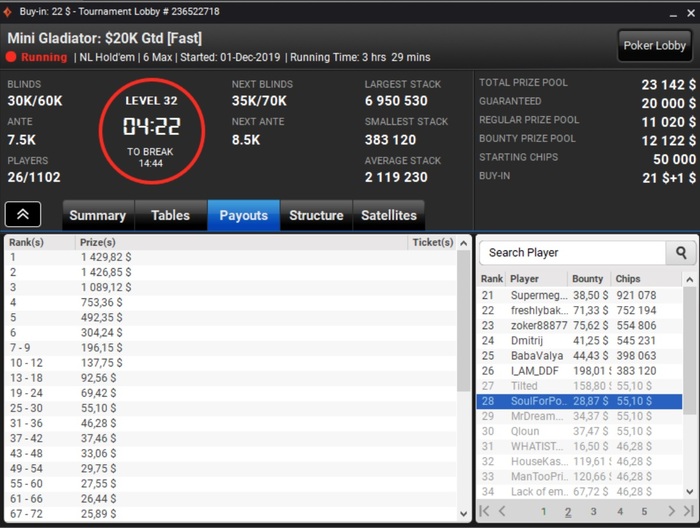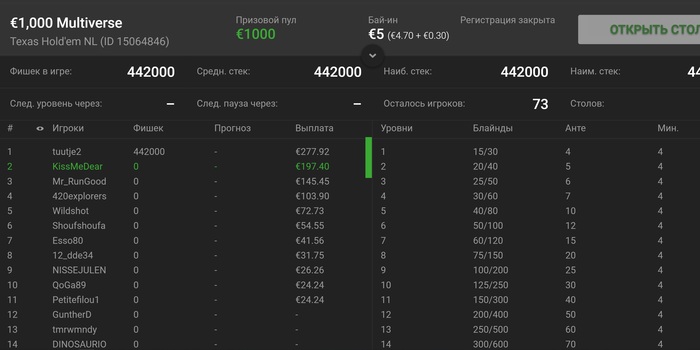 Imbafer, да, зря так рано пообещал, но джипситимовская акция на пати из меня все соки выжала. Декабрь очень плотный выдался, приходилось каждый день без выходных играть кэш 4 стола зум около часа, 2 часа играть снг столов 9-12 и часов 6-7 мтт. И не просто играть, а плюсовать. Сейчас жду пока пати проведёт оставшиеся 2 шутаут фриролла и на джипси доначислят билеты за прошедшие 2 недели, тогда будет длиннопост с подведением итогов. Наверно туда же и вторую часть запилю, чтобы совсем длиннопост вышел