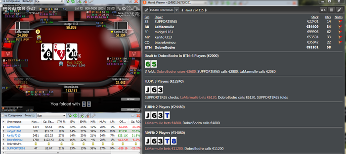 UTG: 103,356 (41.3 bb)MP: 70,653 (28.3 bb)