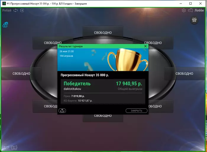 Но в покер то поиграть надо. К часу дня мы снова на Джокере, турик за 50 рублей (около 15$). Было не сложно, просто выиграл все олл-ины, не забыв выбить друга из турнира. Как результат дали 1000 рублей и...