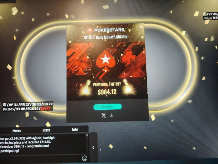 К часу дня мы снова на Джокере, турик за 50 рублей (около 15$). Было не сложно, просто выиграл все олл-ины, не забыв выбить друга из турнира. Как результат дали 1000 рублей и...