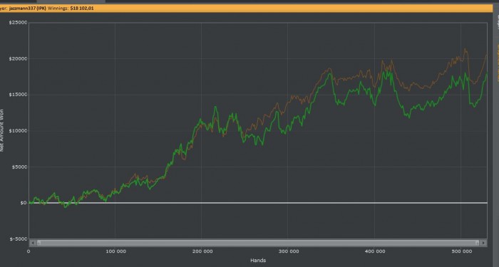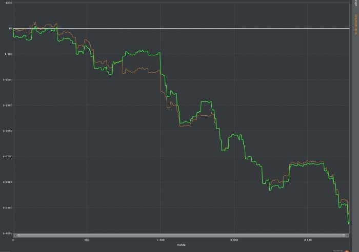Hero shows (Two Pair, Queens and Fours) (Pre 69%, Flop 80%, Turn 67%)