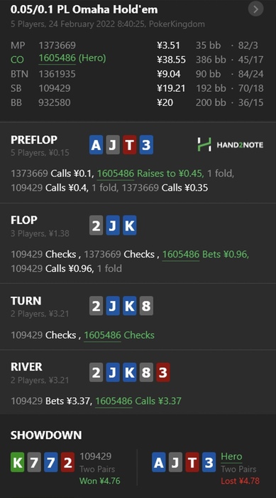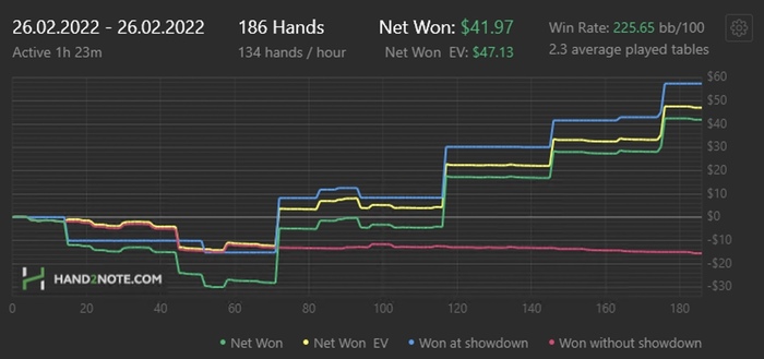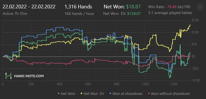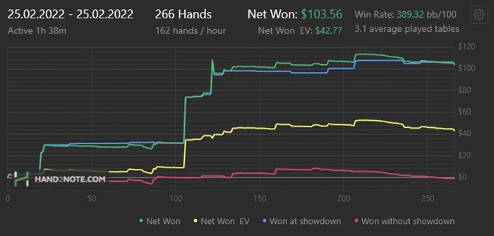Day: 447 hands, +59,7$, по EV +58,71$