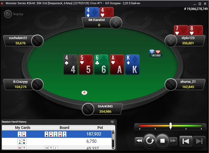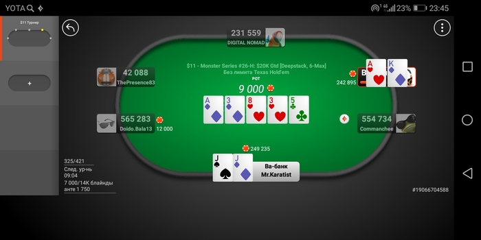 в PLO8 весь турнир чипаком шел,вылетел за 20 мест до призовых попав в старший флеш за чипстек