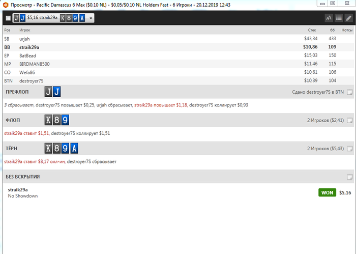вторая - против меня регуляр, который трибетил меня на протяжении всей сессии, играл очень агрессивно, если бы не пришел туз, то я бы скрывал его.