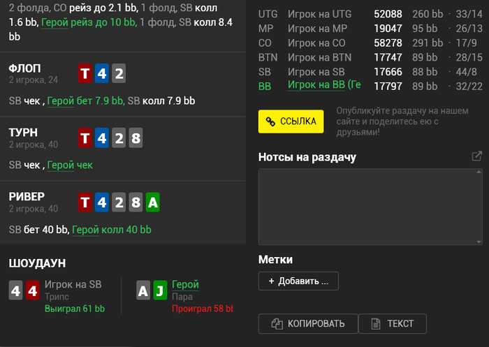 В спарки с ББ можно часто донкать - сайзинг обычно используется около 30%. Почему в спарки особенно циферные мы хотим донкать, потому что у ББ перевес по этим рукам, особенно против ранних поз. Ривер обычно без доблефа, мы уже выбили все что хотели на терне из рук сильнее, но доехав надо вельюбетить жадно