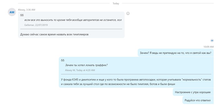 Гамп же считает видимо, что этим можно меня уязвить? Нет нельзя. Я не буду раскрывать имена тимплееров, и изза NDA и тем более, что по-моему глубокому убеждению и фактам (а кто знает их лучше чем я? первые полгода все так или иначе играли _только или почти _только подо мной) ребята только давали ответку, сначала все играли честно. Тимплей вестернов начался только тогда, когда с Китая (может с других агентов?) поперли команды, устраивающие карусель. По сути было два варианта у игроков 1. промолчать и потерять рынок 2. бороться, я лично не знаю другого способа, кроме встречного тимплея. Я не претендую, на то что решение моё идеально, но как вы все знаете мне нужны были деньги и это пролезло в мою мораль, и лично я не тимплеил. Я не организовывал тимплей, но невозможно было остаться в стороне, когда от китайских хостов полетели пачки жалоб, мне приходилось на них отвечать, иногда часами и личными встречами, я защищал как мог интересы своих игроков. Я лично не могу на 100% утверждать что тимплей был, но конечно на очень высокий % могу, так как слишком много факторов на это указывает.