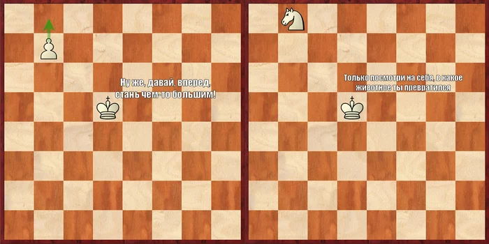 В университете я познакомился с моим другом Д., который уже в 19 лет взял "мастера ФИДЕ" и до сих пор играет в шахматы на высоком уровне. Однажды мы зарубились на лекции, как помню, играли на крохотной походной доске. Друг часто отвлекался на преподавателя и ходил особо не раздумывая, поскольку в уровне я ему сильно уступал. И вот, во время партии я проворачиваю хитрый план: делаю вид, что хочу побить пешку, а сам прицеливаюсь на мат. Д. не замечает ловушки, и я одерживаю первую и последнюю победу в нашем противостоянии.