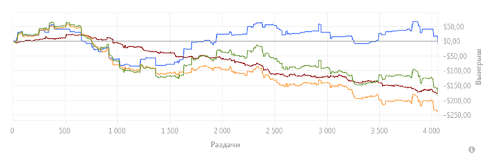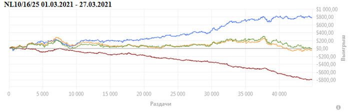 В последние дни старался катать исключительно по таймеру, не смотря результаты. Иногда получалось, иногда нет. Когда не получалось - было острое желание отмазаться. Пытался залететь на нл25 в середине месяца, сказал, что 1,5 часа и 2БИ можно проиграть, не получилось. Дисциплина просто улетучилась в момент игры, это очень плохо. Будем продолжать работать, удачи всем за столами!