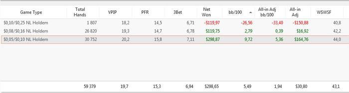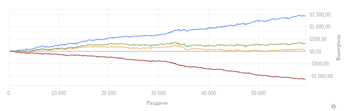 Подвожу итоги месяца. Сыграно 60 тысяч рук с сильным перебором по ЕВ, а это значит, что игра портится, как сказал мне тренер. Зафиксированных ошибок у меня на 201$, но это только то, что я записывал. Полагаю, что сумма ошибок около 270-300$, не учитывая моменты, где я переехал кого-то при выставлении на префлопе (прим. JJ vs AA).