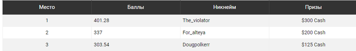 Итоги марафона. Цели: -показать вр лучше чем -3бб/100 Залил 5670, вр получился -4,4бб/100. Провалено, вроде делал что мог, в тильте было залито не более 15 БИ, походу ухудшилось соотношение рег/фиш из-за акции, ну либо я не в состоянии лучше показать, либо накопленная усталость, либо диспа -брать 1-4 места Тут все четко, даже ни одного четвертого 1е взял - 7 раз 2е взял - 9 раз 3е взял - 6 раз -сыграть 500к рук Тут справился с запасом, даже закончил на 2 дня раньше 515,7к рук. -хоть раз взять первое место когда катают Destonairlines, victoria foxen и EQuaL1ZeR 2 из 3 С Эквалайзером почти не играли одновременно (2 или 3 гонки сыграли), но его бы обогнал, только если бы посреди дня у него свет потух до следующего дня Результатом доволен на 4 из 5, чуть бы меньше залил (на косарик примерно) и было бы вообще идеально Ну а теперь еще немного чисел: Заплатил рейка: 8141 Сыграл: 282ч Гонками взял: 4650 Получил фактического РБ: 2920 Ожидаю к выплате по акции: 1720 Рыбалка и другие плюшки: подсчитать тяжело, т.к. еще не все результаты известны, но не меньше 1400 Итого: -5670 + 4650 + 2920 + 1720 + 1400 = 5020 Всем огромное спасибо за внимание