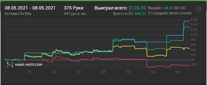 Всем привет. На данный момент практически восстановил банкролл до уровня до стрика, нл25 встретил меня очень хорошо. Ввиду этого, сегодня пришла идея попробовать еще раз шотнуть нл50, на этот раз со стоплоссом 4би, чтобы исключить повторение предыдущей истории. Честно говоря были сомнения. По итогу сыграл короткую сессию , 375 раздач.