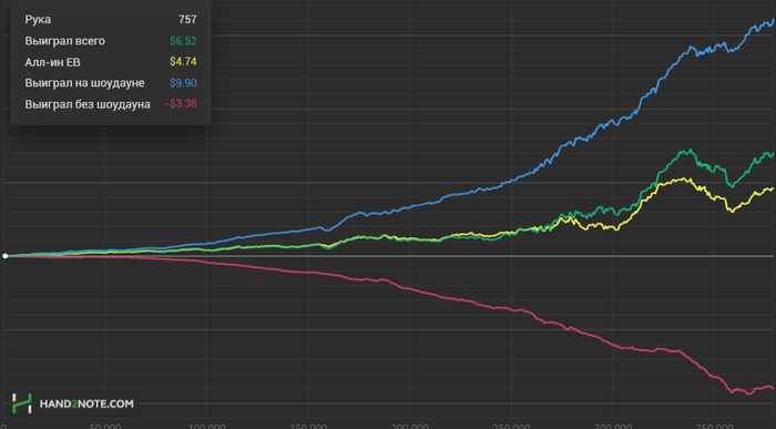 Но если взять такую же ситуацию на флопе 63T радуга, у карманных тузов уже всего лишь около 10%. Линия ев не покажет какого-то огромного перебора в отличие от предыдущей ситуации. Значит ли это, что на этот раз фиш выиграл справедливо? Ситуации то абсолютно идентичные, особенно если это 3бет/4бет пот. Ситуации по сути одинаковые, результат тот же, а восприятие у одного человека может быть диаметрально противоположным. Просто мозг привык всё упрощать, делить на чёрное и белое, потому что так проще. Именно в эту сторону я клоню. Кто-то на средней дистанции тащит монетки, получает перебор по линии ев, а вместе с ним ожидание что рано или поздно дистанция его *бнет. Другой на той же дистанции намного чаще кулерит оппов постфлоп, и на линии ев всё красиво, почти без перебора. Хотя по факту оба могут находиться в одинаково хорошем ране, просто в разной форме. Думаю что линия ев имеет большое значение как индикатор реального уровня игрока, но только на большой дистанции, как минимум несколько сотен тысяч рук(тут я не спец, чисто имхо) на лимите, а основное внимание всё таки стоит уделять зелёной.