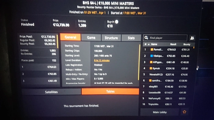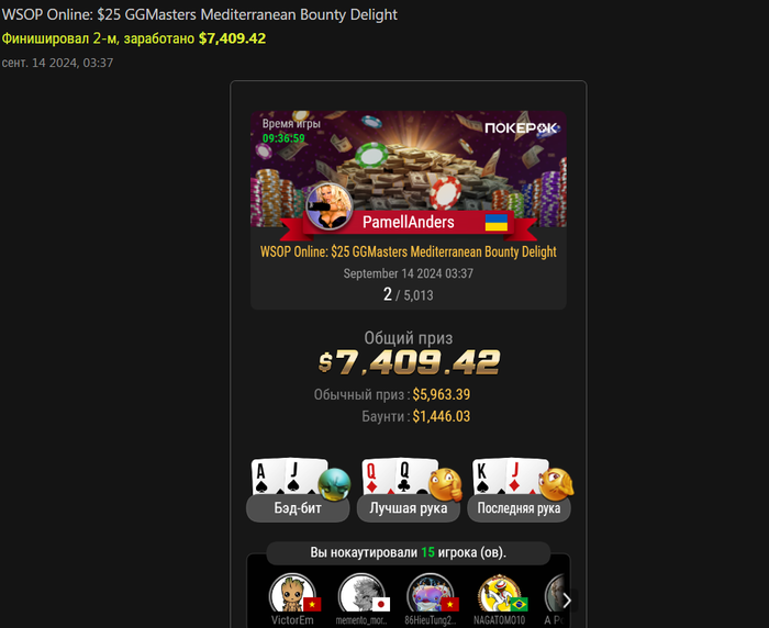 Вышел на финалку с первым стеком, но каким то образом проспал рассадку , не успел секунду чтоб место занять , не смог определиться куда лучше сесть хотел или на место мрбоди или бразила и понеслось...Удвоил всех коротышей , хоть не 9 вылетел)) 4 место