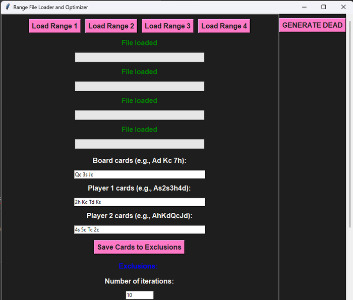 Дальше нам понадобится вторая программа. По факту это обычный, не очень удобный и мало функциональный эквити калькулятор, но со своей особенностью: он умеет работать с файлами из предыдущей программы и автоматически считать эквити с учётом мёртвых карт по нажатию одной кнопки: