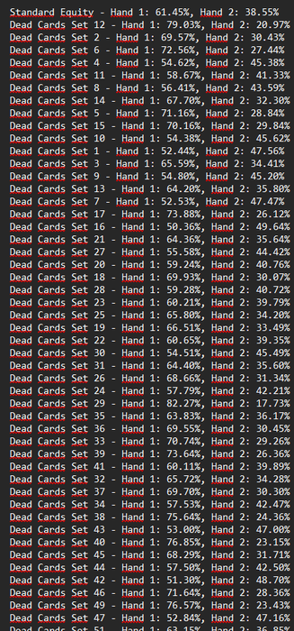 Забегая чуть вперёд скажу, что это не шум и не случайный результат, так как я провёл много тестов, но что самое тут важное - что общий импакт на 6 максе при игре в 4 карты минимален. Так что если вы никогда не задумывались про кард ремувал на флопах - возможно и дальше не нужно. Может быть в каких-то самых граничных ситуациях где речь идёт о +-1% эквити можно вспомнить что карты колеса обычно в сбросе, а тузы обычно в колоде, но граничные ситуации на то и граничные, что много денег мы там поиметь не сможем никогда)