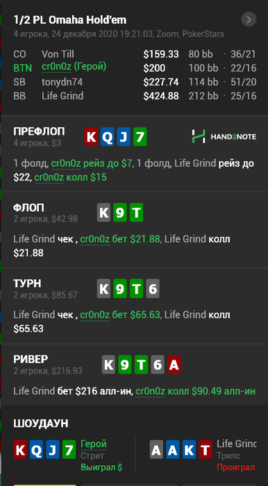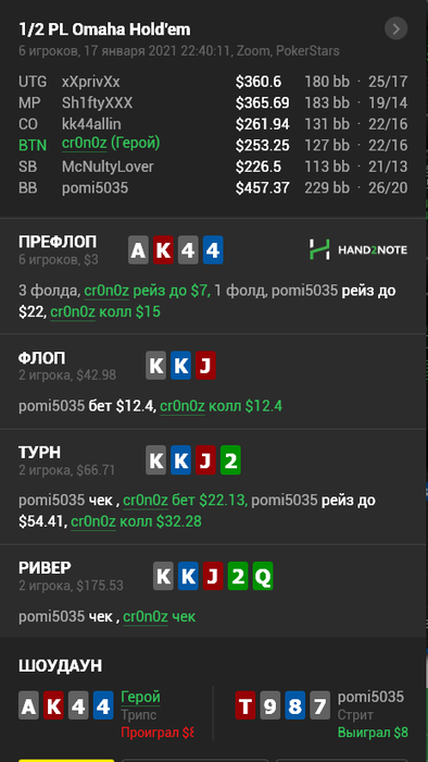 Ну че рассказать, интересного мало. 200к рук в з100-200 в ноль отыграно и это удручает. Удручает то, что я провел уже столько часов в софте и за просмотрами видео, а профита нет. С другой стороны может я завысил свои ожидания, ведь я всего ничего играю в омаху и играть з200 в 0 это уже может и неплохо за такой промежуток времени. Но я же вижу как плохо играют регуляры. По ощущениям грубых ошибок я допускаю меньше большинства регов. Значит остается 2 варианта: диспа пока не дает нажить, либо психологическое состояние влияет так сильно на качество игры, и в моменты психологических провалов я не замечаю как плохо играю. А с психическим состоянием уже давно не все гладко, мб год уже. Бывает скатываешься в такую яму эмоциональную, что кажется, что у тебя уже депрессия и пора обратиться к психиатру, но проходит пару дней и внезапно появляется хорошее настроение. Не знаю. Обратиться к спецу, скорее всего, никогда не ошибка будет. Главное, чтобы хороший был. Мб действительно если наладить немного психологию, то и результаты пойдут в гору.