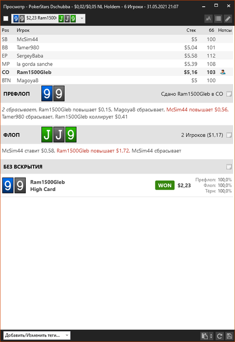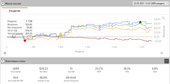 Ram1500gleb, ну значит я минимум одно действие за сессию сделал верное. У меня были , я в 3бет полез с планом не лезть дальше, если что. Но, наверное, у меня был тильт, что я все же залез в 3бетпот и решил банк разгонять на флопе. Переигрываю все руки.