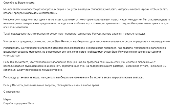 Забота от старзов так и прет: бла-бла-бла и ничего по делу. У них политика, наверное, построена так, чтобы привлекать в разные дисциплины. У меня долго в челленджах висели спины. Не играю - получи другой челлендж: сделай ставку на матч МЮ - Вильяреал!