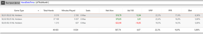 Если честно, в мае я превзошел сам себя...ну хотя бы по количеству сыгранных рук - аж 46,6к. Если честно, то это прям неожиданно было, и несколько приятно. Я теперь знаю, что можно спокойно и без напряга играть на 6 столах 50к+ рук в месяц.