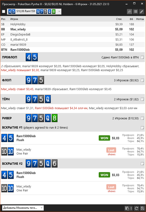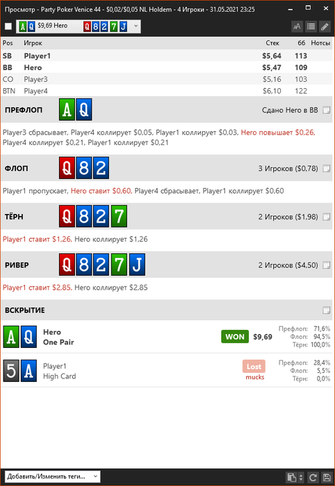 Да, когда опп по терну в меня вдруг резко донкнул, я конечно немного был озадачен. И уже стал предполагать, что у него вдруг нарисовалась 2я пара (или он защищает доперы Q8-Q2), или сет ему вдруг плюхнулся.
