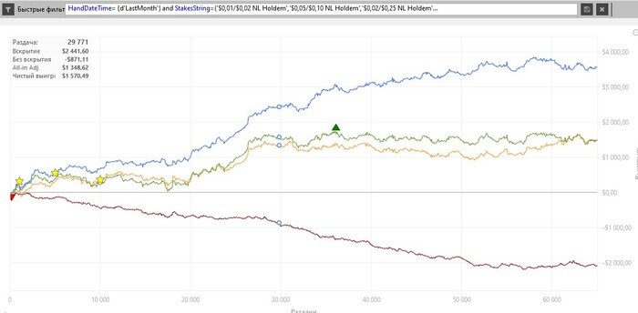 2 По игре. Уже особо не помню, кроме того что первую неделя прошла +- в апчике, вторая в жестком упадке мотивации. Ну и в конце месяца катнул несклоько небольших сессий где в основном подзабыв префлоп экспериментировал с некоторыми ллиниями и сайзами в слабый минус(хз зачем пишу - там дистанция то от силы пару к рук)