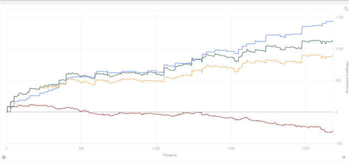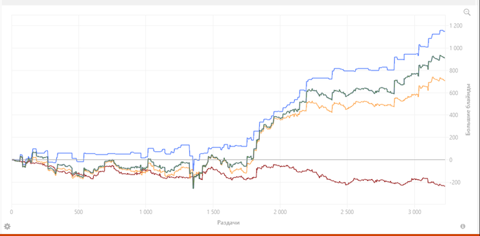 Но если посмотреть на график и ты не фартовый. то ты можешь играть 10 бб а по факту идти в ноль Мало вероятно, но это для понимания дисперсии. И это 10 бб, если взять 5-7, ещё хуже ситуация будет