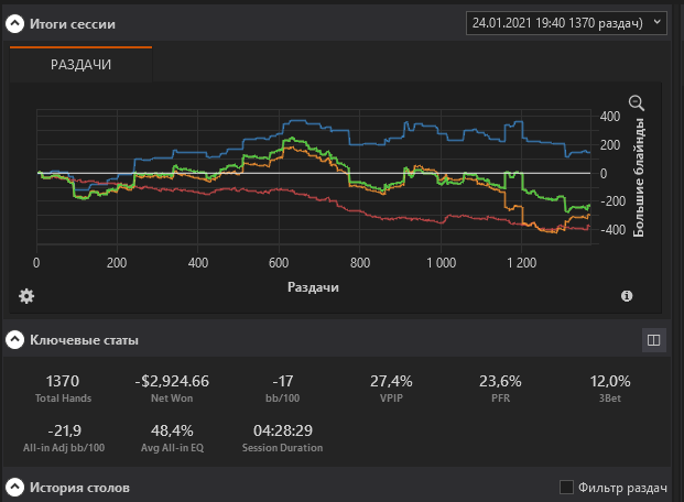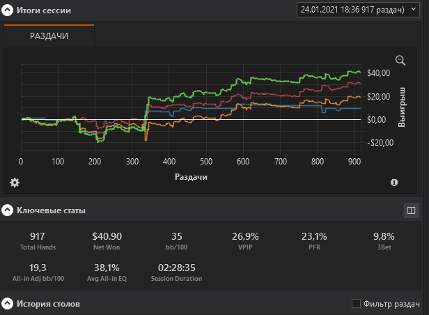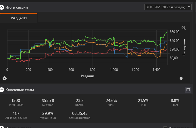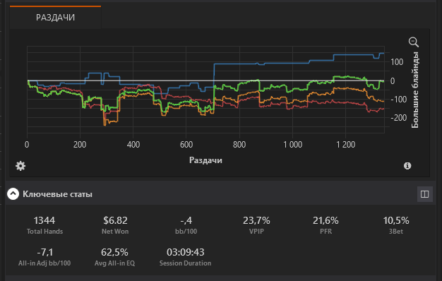 Эту дистанцию набивал 7 часов , играя 5 столов. Больше нельзя. Пока конечно делать выводы о результатах рано, но на 5к+ рук EV20бб/100 не может не радовать . Плывем дальше
