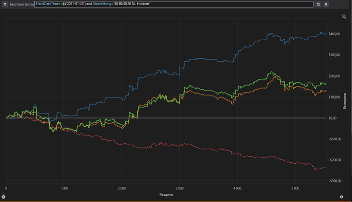 Всем привет, блог не забросил, покер тоже ) . Промежуточный отчет нл20 И вчера чуть решил поиграть на старзах преимущественно нл16 Вообщем планы не меняю. В конце февраля перехожу на нл25 старзовые. На pppokere бью нл20, то и на старзах побью. Графики не полные выложил , там еще 5к рук с винрейтом 10бб/100 . Валюта просто не баксовая, показатели другие.