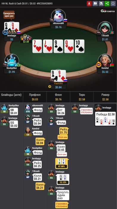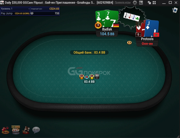 мы бет 2.5 бб все фолд, банк (2.5+1+0.5=4 бб)