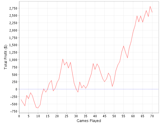 Вчера, играя стиснув зубы, после очередного переезда я молча закрывал турнирное лобби проигранного матча.Я понимал что в большинстве случаев я принимаю правильные решения(как по мат.ожиданию,так и по логике),вопрос был только в одном ,каковы пределы стрика? Всем известно что супер.турбо очень дисперсионная вещь,и частые стрики неизбежны.Уже с весны прошлого года я переживаю стрик за стриком в этой "пиханине",и с каждым таким разом я становлюсь сильней.Обычно мне удавалось уже на следующий день отбить весь минус недобора(за исключением одного раза когда стрик не мог меня покинуть в течении 2500игр.),вот и сегодняшний день не стал исключением. Сыграл небольшую минисессию из 70 матчей.Решил варьировать лимиты для разбавки диспы,играл игры от 100 до 350 $.( c abi в 208$) По началу складывалось впечатление то что придется и сегодня терпеть капризы ГСЧ,но вскоре ситуация нормализовалась,немного даже перебрал. Играл я сегодня с разными ребятами,но один товарищ запомнится надолго.Первая раздача(до этого играли с ним,по статам фиш,по игре может быть неадекватен в агрессии) у меня ,я опрз 40..тот 3бэт 120 :),ну и по всем вытекающим нотсам,статам,историям лич.встреч я изи пушу он инстаколл,смотрю в надежде что не вмазался в оверпару и неожиданно для себя наблюдаю ,и это игра не за 5$ а "всего лишь" в 70 раз выше.Хорошо еще что эта "монетка" оказалась в мою пользу. Так же поиграл с очень серьезными людьми.Два раза подсаживался Plz_Stop_Lookin(профит 680К),разошлись миром 1-1.Дал отпор (в виде выигранных 2-4 БИ) регулярно подсаживающимся ,двум ,средним по статам регам 10Sai и n00ki5.(быть может перестанут садиться ко мне,хотя я уже незнаю хорошо это, или плохо для меня).Больше всех сегодня досталось моему вчерашнему обидчику DONT STAKE ME(+1K в мою). Вот и график этой минисессии.Всем удачи!