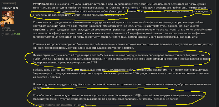 Проанализировав происходящее я понял, что я не пробовал играть нл100 сх, и сразу как придурок прыгнул в новую дисциплину на лимит выше + при всем при этом я сразу начал ебашить регвары, которые до этого никогда не играл, и практически любые составы. Селектить через вейт листы, еще раз повторюсь, максимально неудобно, всех фишей съедают пока до тебя дойдет очередь, поэтому регварить надо обязательно + мое эго не дает мне покоя, почему кто то блять может их играть в 0 или слабый + а я нет, по стефану дак мы вообще должны иметь положительный винрейт причем нехуевый! Я максимально убежден в том, что играя любые составы, ебашась в ХА и в тримаксах с топ регами, мы максимально прокачиваем свою скиллуху, это все нам окупится со временем и мы будем иметь эдж над полем, выбрав более легкий путь и играть без регваров - это путь в никуда, это зона комфорта которая деградирует нас! я хочу оказаться на ХАЙСТЕЙКС! Я хочу держать лобби! Я хочу быть топрегом! И именно такой план которого я придерживаюсь открывает мне туда дорогу! Я могу сделать как сделали мои чуваки из конфы, про которых я писал ранее, я могу мультирумить 3-5 румов 50-100-200-500 ФР, играя 9столов,с селектом от -100 и снимать самые сливки, и иметь ожидание от 5-6к, но я не хочу! я рано или поздно упрусь в потолок! Мне все равно придется переходить на СХ если я хочу пойти выше и лучше сделать это сразу, чем потом вынужденно, когда фр умрет. Мне понравилась фраза АЙСМЕНА из подкаста дорогих братьев, что если ты играешь ради денег, тебе не быть лучшим, нужно быть фанатиком. ЕБАТЬ ПАЦАНЫ! Я КАК ЭТО УСЛЫШАЛ У МЕНЯ МУРАШКИ ПОБЕЖАЛИ ПО КОЖЕ! Потому что именно такой политики я и придерживался всю жизнь! Я перечитываю посты стефана 2014 года, который тоже примерно в этом ключе, как и я размышлял в свое время. Я переслушал все подкасты с топами на всех покерных каналах и понял, что я не совсем безумец и доля истины в моих словах и в плане имеется!