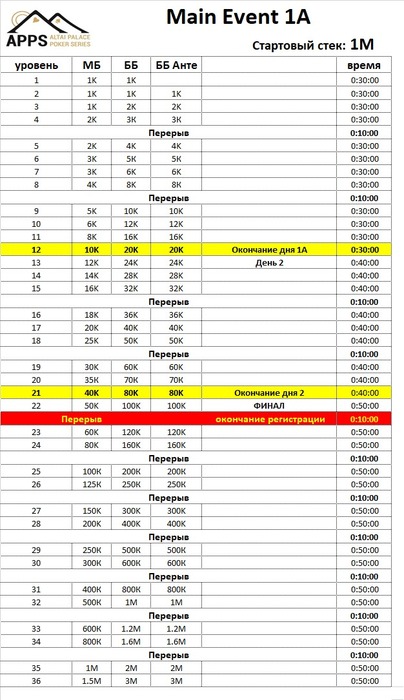 Регистрация длится в течении всего турнирного дня - 12 уровней по 30 минут.