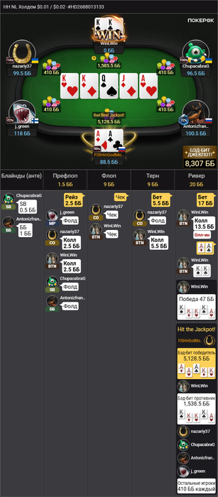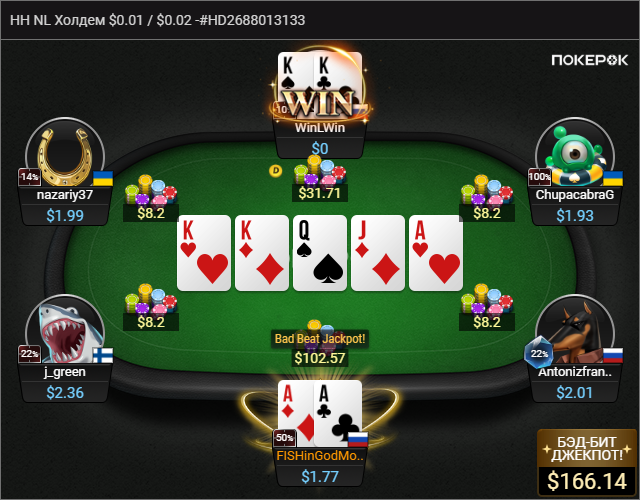 Сейчас сел поиграть часок, через 5 мин упал Джек Пот. Так как играю нл2 - маленький. Но безумно приятно. Спасибо покеру за эмоции)) Как раз перед сессией про себя думал, когда уже апнет))