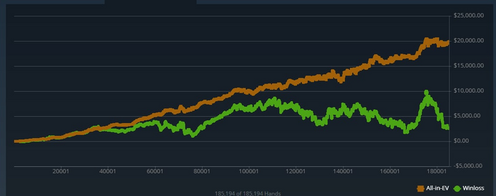 С учетом того, что представленный выше график отражает далеко не полную картину, а предшествующая ему карьера на ГГ шла в схожих векторах + игра на старзах также по дефу идет андер ЕВ, в среднем шортдэк мне "приторчал" тыщ так 30 бакинских при среднем играемом лимите анте1.